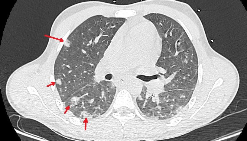 Les patients atteints du syndrome de Lemierre peuvent souvent se présenter à l'hôpital avec des preuves de lésions métastatiques dans les organes cibles [8,9]. Lorsque la thrombophlébite septique de la veine jugulaire interne (VJI) se produit, les emboles septiques formés peuvent se propager à divers sites, notamment les poumons, les articulations, le cerveau et le foie [9]. Cela peut entraîner des pathologies graves des organes qui peuvent nécessiter une intervention chirurgicale. Les poumons sont généralement les organes les plus touchés, et les patients peuvent développer une pneumonie, des empyèmes, des abcès pulmonaires, des épanchements pleuraux ou des emboles pulmonaires septiques [4,16]. Ces manifestations se traduisent souvent par des douleurs thoraciques pleurétiques, une dyspnée, une toux et une hémoptysie [37]. Lemierre lui-même avait noté que les manifestations pulmonaires étaient annoncées par « une douleur thoracique intense d'apparition brutale, une dyspnée, parfois des crachats teintés de sang ou rouillés, des frottements pleuraux, et des zones localisées de râles sous-crépitants » [3].