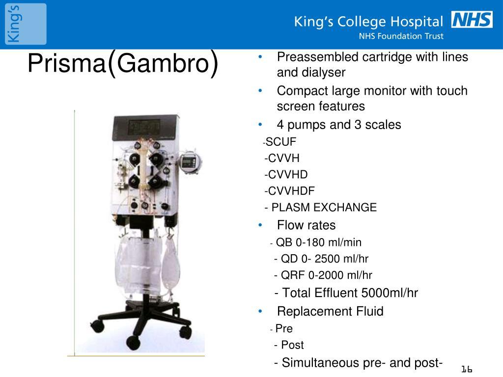 - Technique de CVVHDF avec appareil Prisma des années 2000 (limité Qsang max = 150 mL/min/ UF max = 1 500 mL/h/Dialysat max ≈ 1 500 mL/h) - l'adjonction d'un mode diffusif (DIA) compensait le faiblesse convective (FILTRATION).